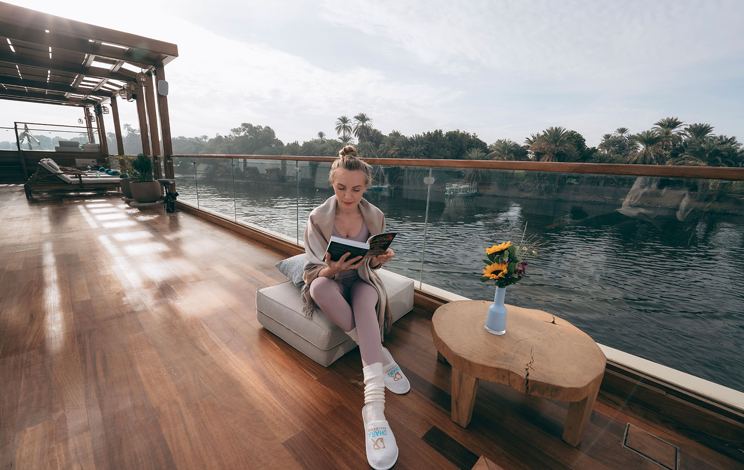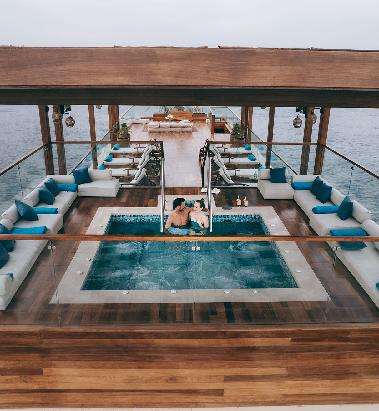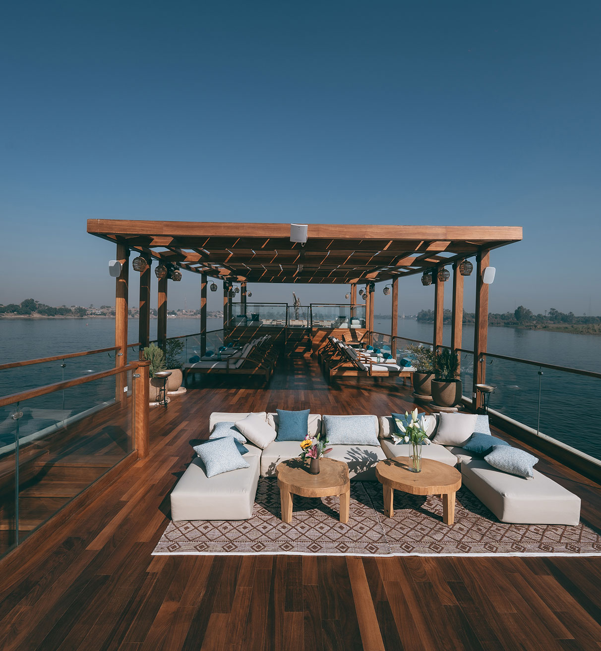 Sun, shade, and river breezes meet across expansive shaded decks, intimate lounge corners, and a private jacuzzi deck.